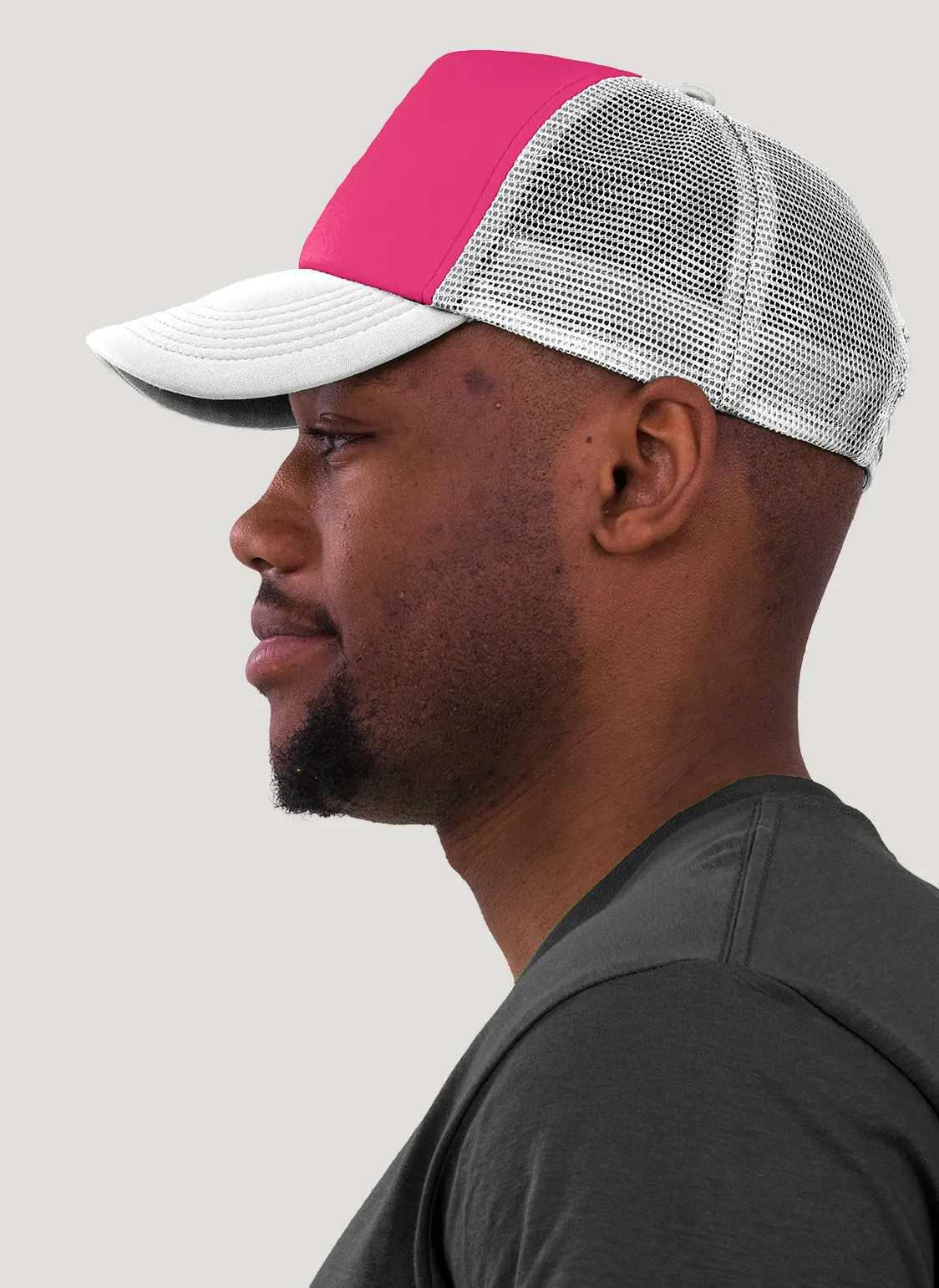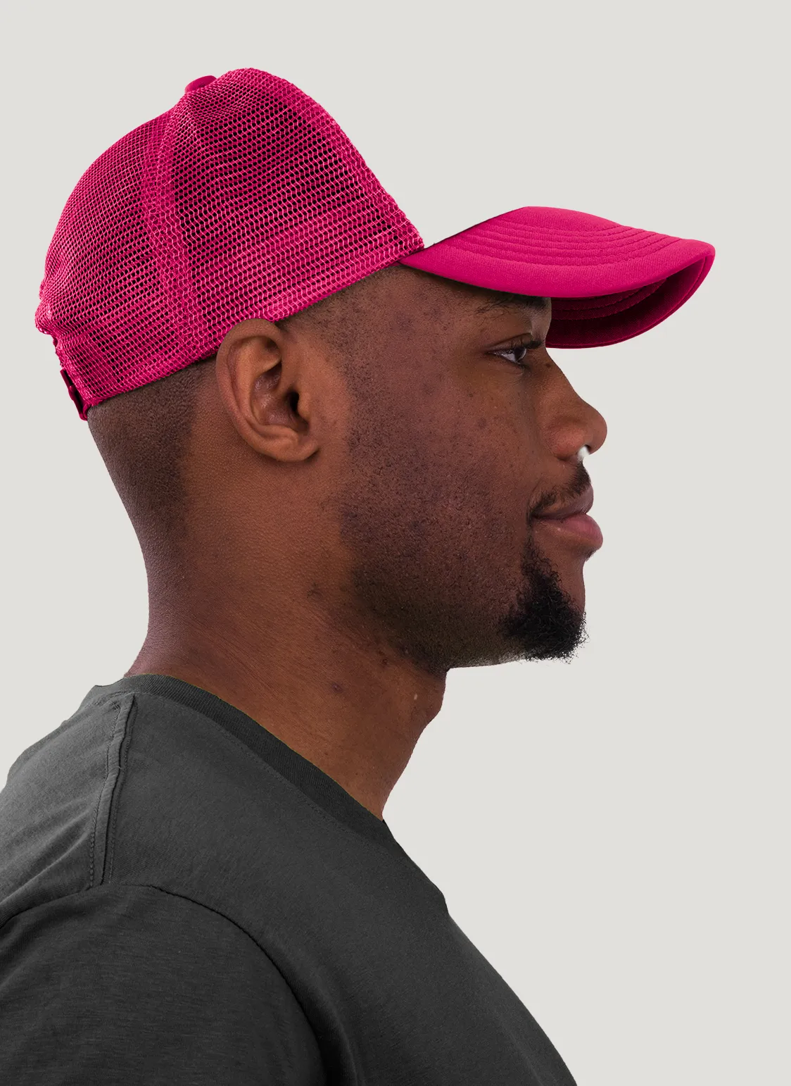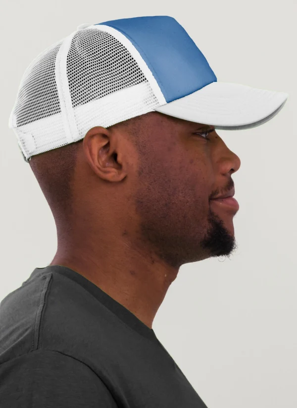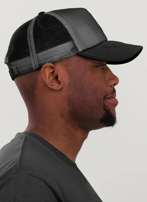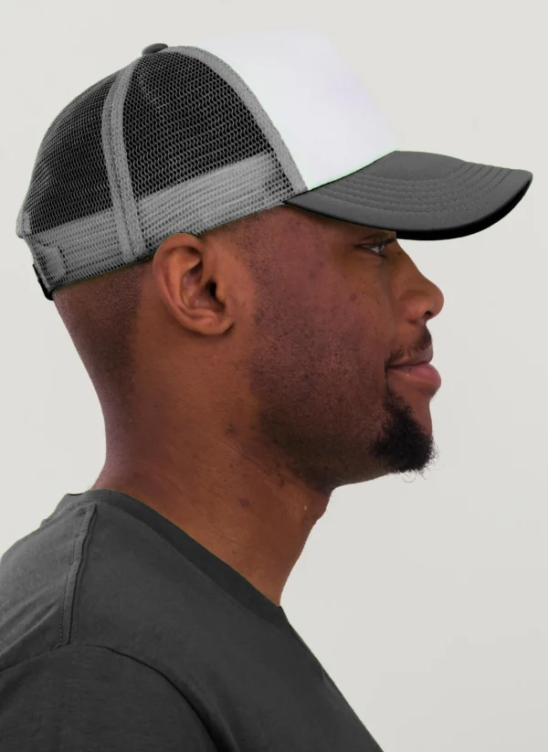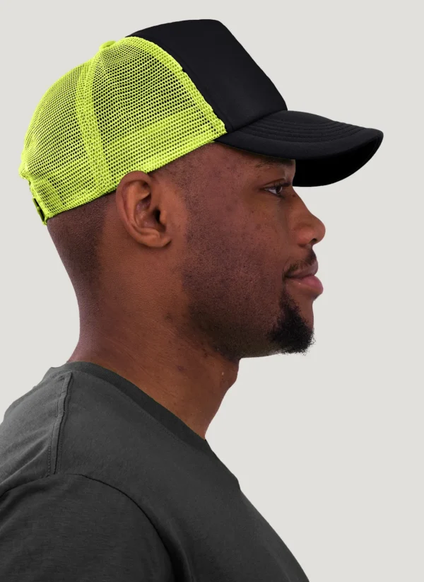 Die rechte Seitenansicht dieser trendigen 5-Panel-Mesh-Cap zeigt die perfekten Ziernähte auf dem Schild, die für einen eleganten Look sorgen. Mit dem praktischen “click & snap” Verschluss lässt sich die Größe individuell anpassen und garantiert optimalen Tragekomfort.