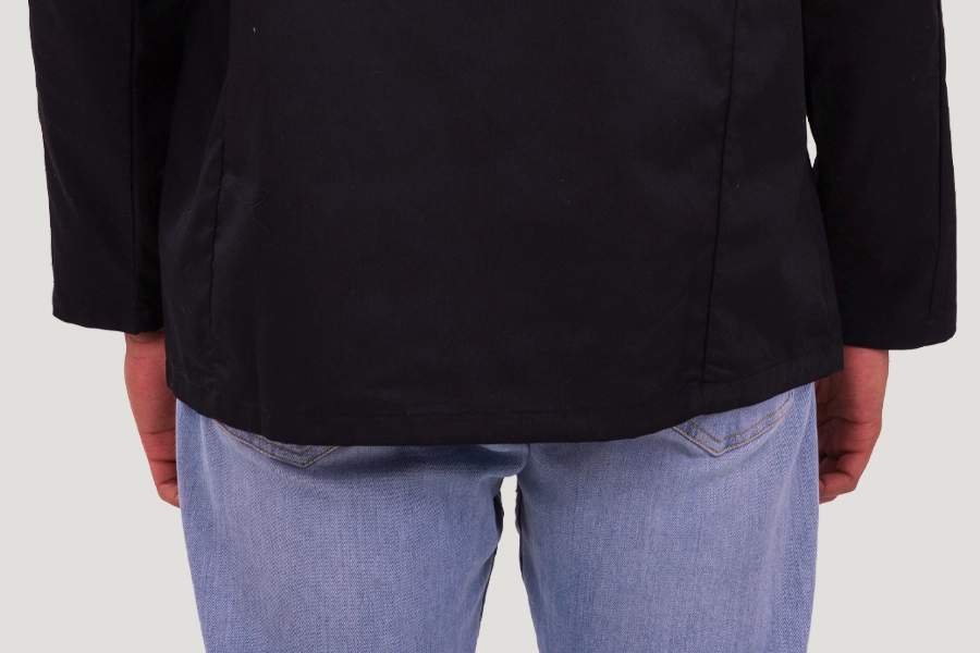 Der abgerundete Saum sorgt für eine stilvolle Silhouette und bietet gleichzeitig Bewegungsfreiheit dank der praktischen Seitenschlitze und Lüftungslöcher. Dieses Kochhemd aus 100% Baumwolle vereint Funktionalität mit einem modernen Look.