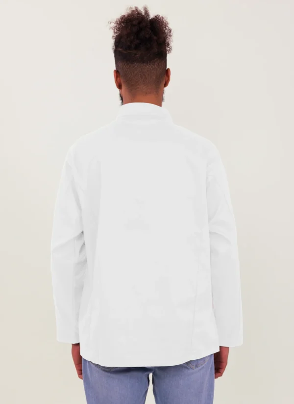 Der langärmlige Schnitt dieser klassischen Kochjacke umschmeichelt sanft dein Handgelenk und sorgt für einen stilvollen Look, während die robusten Edelstahl-Druckknöpfe an der zweilagigen Vorderseite für Funktionalität und Langlebigkeit stehen.
