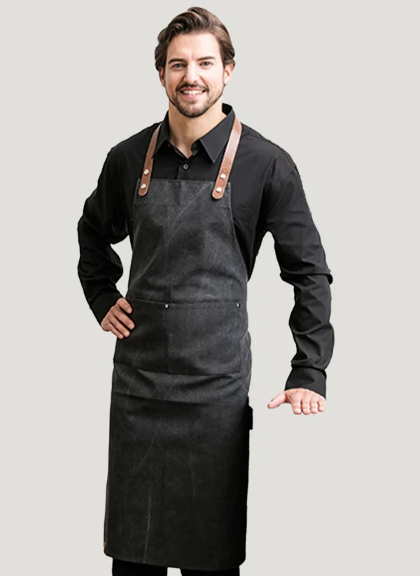 Die mittlere Ansicht der Latzschürze zeigt ihre unverwechselbare Charakteristik, die klassischen Charme mit urbanem Look vereint. Mit einem robusten Köpergewebe aus 65% Polyester und 35% Baumwolle bietet sie nicht nur Pflegeleichtigkeit, sondern auch praktische Taschen für alle deine Utensilien.